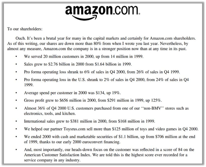 Below is an excerpt from Bezos’s letter to Amazon shareholders after the share price dropped by more than 80%. By all accounts the business had a great year but the share price still got hammered.