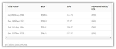 But you’d be hard-pressed to find anyone – outside of founder/CEO Jeff Bezos – who has been able to hold onto their shares for the entire ride. The stock has had its fair share of massive sell-offs. Consider what it would have been like – emotionally – to not sell during the periods in the graph below.